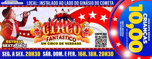 | Ingresso Circo Fantástico |Panambi – RS | 30/11/2025 – Domingo 3ª Sessão | R$ 11,00 – R$ 55,00Price range: R$ 11,00 through R$ 55,00 → Incluso taxa de compra online |