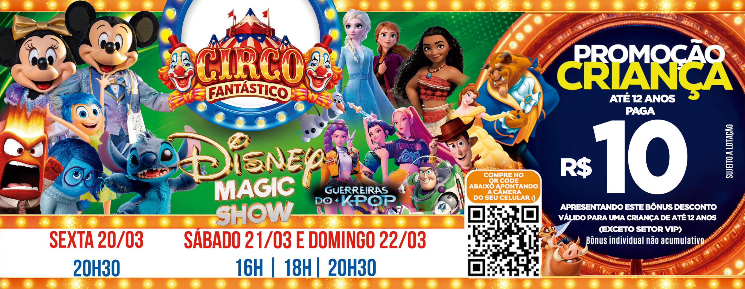 Promoção Especial Sexta à Domingo: Traga toda a família para o Circo Fantastico, Crianças pagam apenas R$10,00 no Setor Lateral e Central apresentando o bônus! Uma oferta especial para tornar o espetáculo ainda mais acessível e divertido para as crianças. Aproveite!